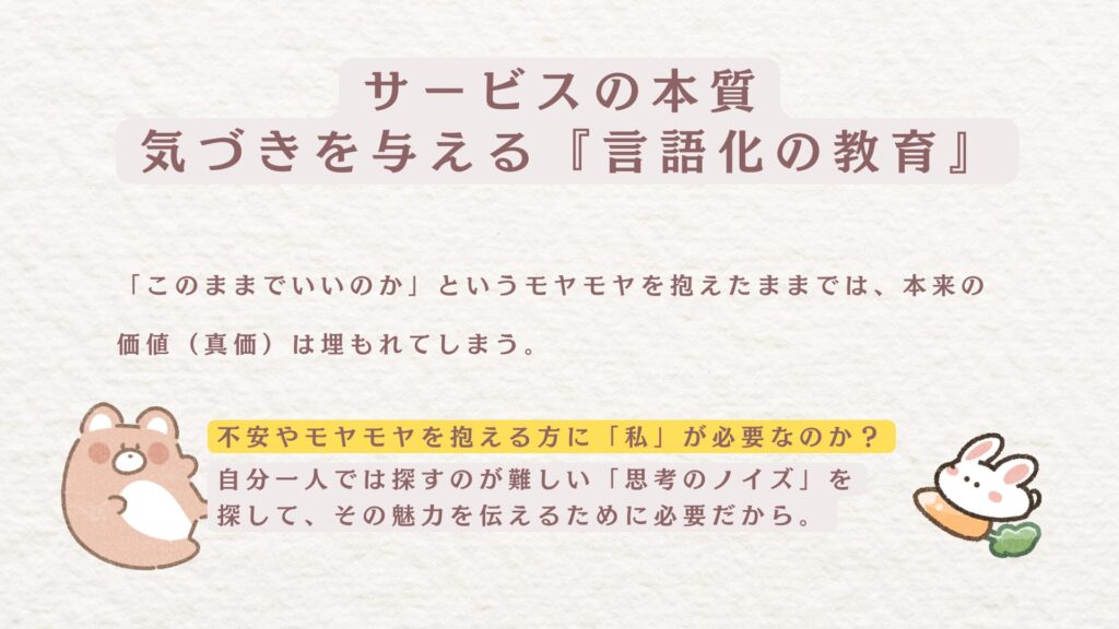 提供サービスの本質:気づきを与える「言語化の教育」