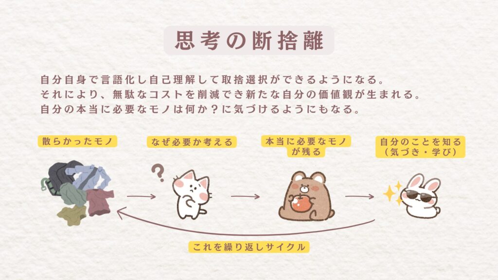 モノの取捨選択を通じて「なぜそれが必要なのか?」という判断基準を明確にすることで、迷いのない人生の選択ができるようになります。